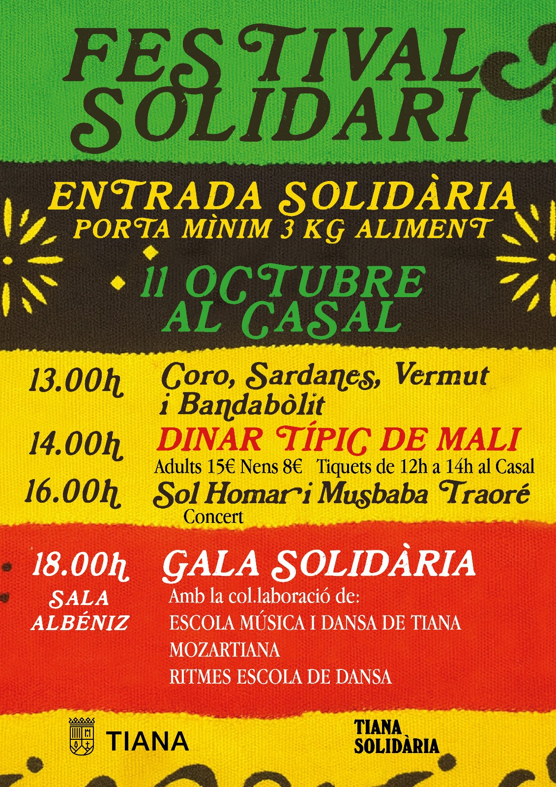 El dissabte 11 d’octubre a partir de les 13 h començarà el Festival Solidari al Casal de Tiana, l’entrada no es paga amb diners, sinó amb aliments (tres quilos mínim). La Societat Coral Joventut Tianenca, l’Agrupació Amics de les Sardanes i la Bandabòlit amenitzaran el vermut solidari, que precedirà el dinar típic de Mali. Enguany el 50% de la recaptació del dinar es destinarà a les obres de construcció de l’Hospital Maternal de Donkelena, a Mali, per tractar les complicacions en l’embaràs i el part de les dones i per rebaixar la mortalitat dels nounats.