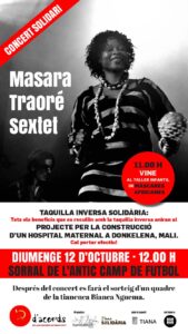 El diumenge 12 les activitats solidàries es traslladen al Parc de l’Antic Camp de Futbol, organitzades per D’acords, juntament amb Tiana Solidària. Començaran a les 11 h amb un taller infantil de màscares africanes, i seguidament el concert amb Masara Traoré Sextet, artista de Burkina Faso afincada a Barcelona des de fa més d’una dècada, a les 12 h serà l’eix central de la jornada, i amb una taquilla inversa solidària es recaptaran diners pel projecte de la construcció d’un hospital maternal a l’oest de Mali.