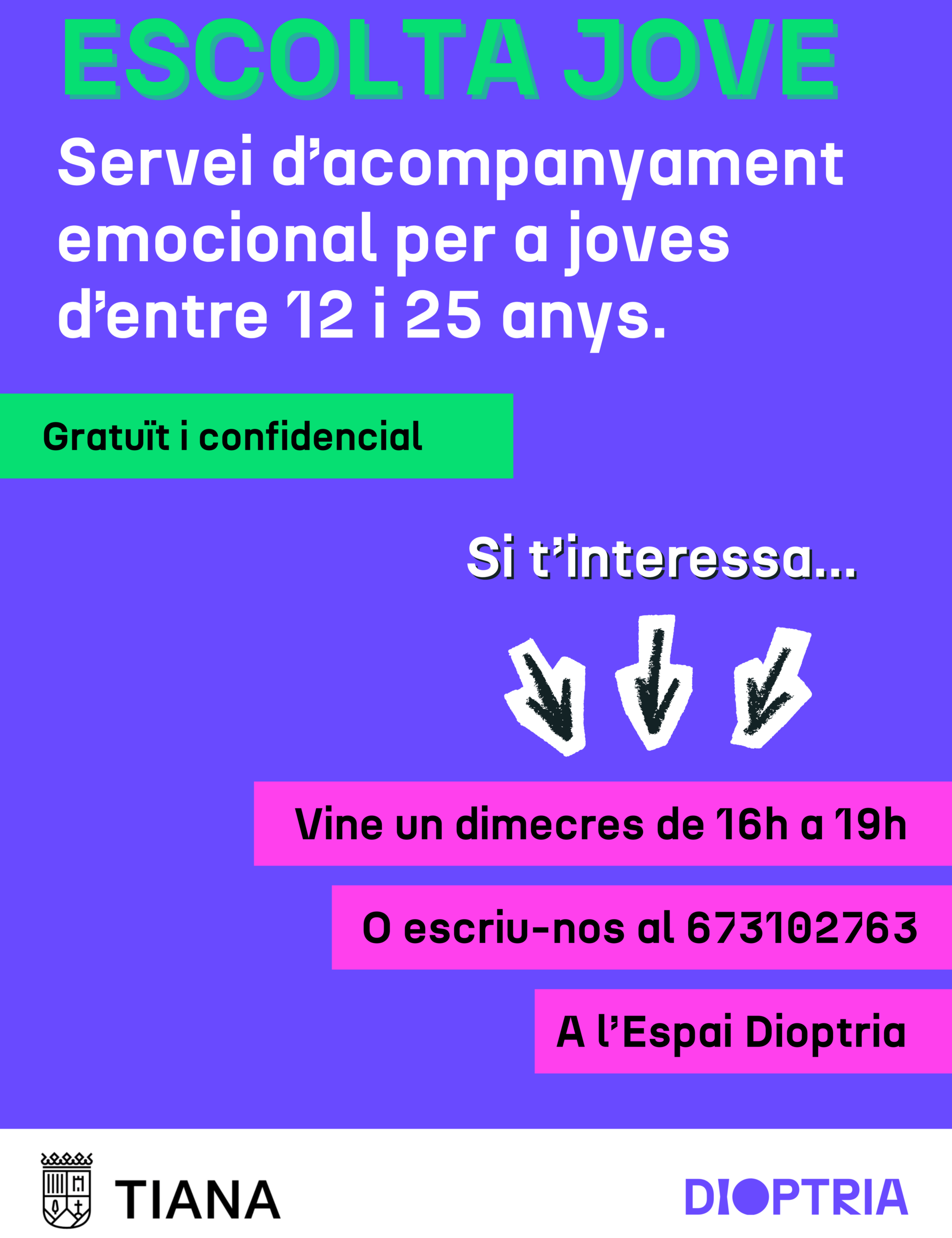 Servei d'acompanyament emocionals per a joves d'entre 12 a 25 anys, gratuït i confidencial. Tots els dimecres de 16 h a 19 h a l'Espai Dioptria.