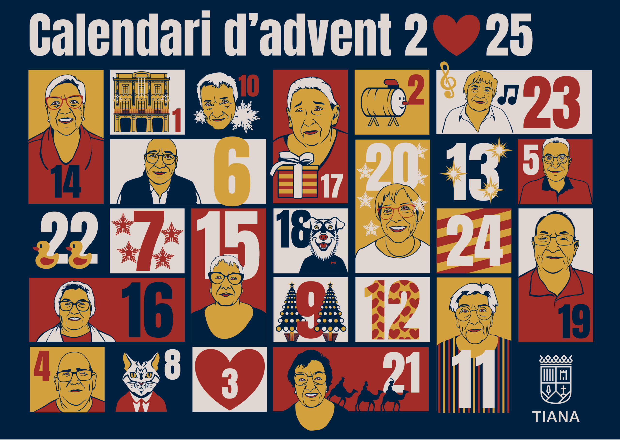 Aquest any el calendari d’advent està dedicat a la gent gran de Tiana. 13 persones que han treballat pel poble fent comunitat. El calendari es repartirà divendres 28 a partir de les 16.30 h des de La Llar de les Persones Grans.