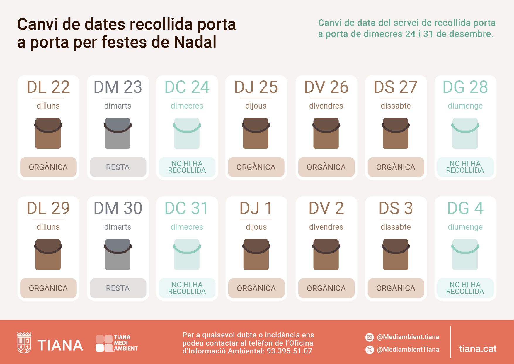Pel que fa al servei de recollida porta a porta, com cada any els dies 24 i 31 de desembre no hi haurà recollida porta a porta. En canvi si que hi haurà recollida de matèria orgànica els dies 25, 26 i l’1 de gener tot i ser festius.