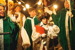 Els fanalers han obert pas a Melcior, Gaspar i Baltasar per primer cop. Darrere seu els carters reials i amb les tres bústies per tirar la carta a darrera hora.