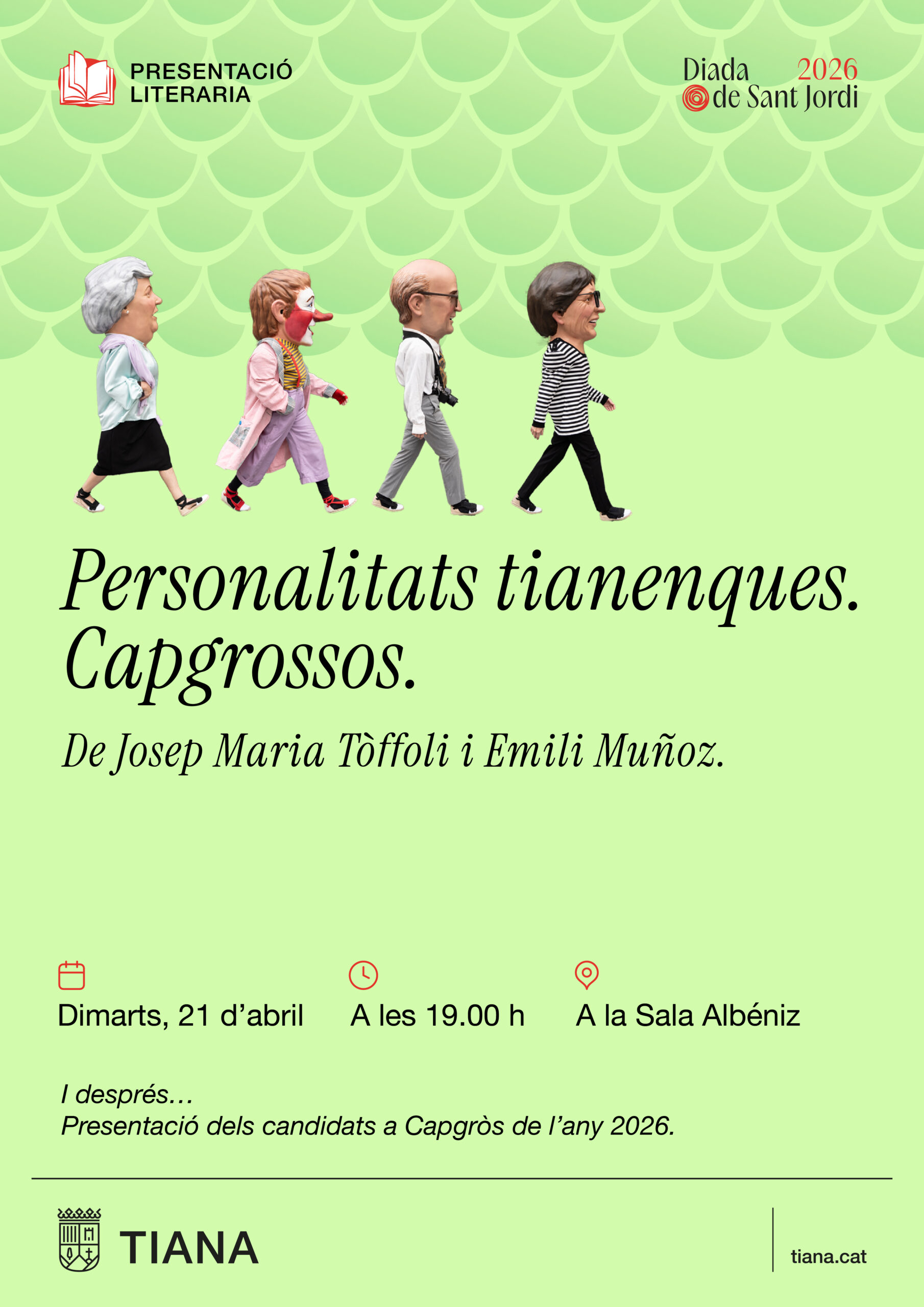 Aquest Sant Jordi sortirà a la venda el nou llibre d’història i patrimoni local. Les personalitats tianenques que donen vida als capgrossos de l’any protagonitzen aquesta edició dels autors Emíli Muñoz i Josep Mª Tòffoli que porta per títol “Personalitats tianenques. Capgrossos“. El dimarts 21 d’abril, a les 19 h a la Sala Albéniz es farà la presentació.