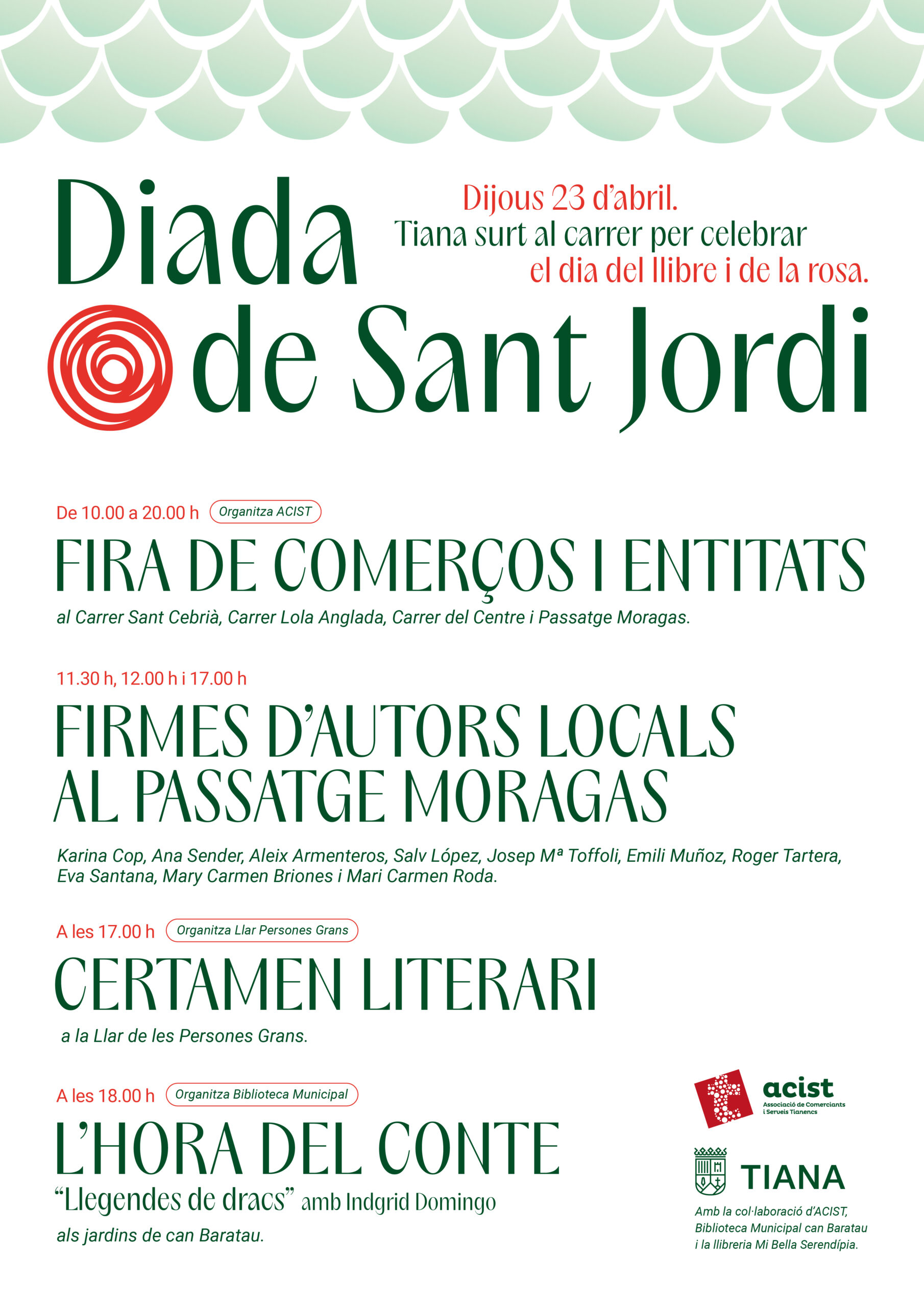 A la tarda, la programació continuarà amb el Certamen Literari, a les 17.00 h, organitzat per la Llar de Persones Grans. I la jornada es clourà amb una proposta familiar: L’hora del conte “Llegendes de dracs”. A càrrec d’Indgrid Domingo, a les 18.00 h als jardins de Can Baratau. Organitzat per la Biblioteca Municipal. Aquesta activitat està pensada especialment per als més petits i connecta amb l’imaginari tradicional de Sant Jordi. Amb aquesta programació, Tiana reafirma el seu compromís amb la cultura, la lectura i el teixit associatiu local.