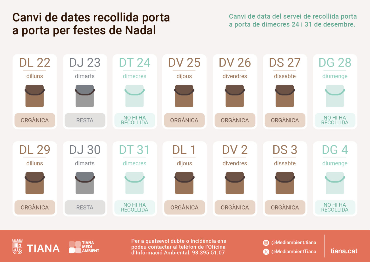 Des de l’any 2000, a Tiana la matèria orgànica i la resta es recullen porta a porta seguint un calendari establert.