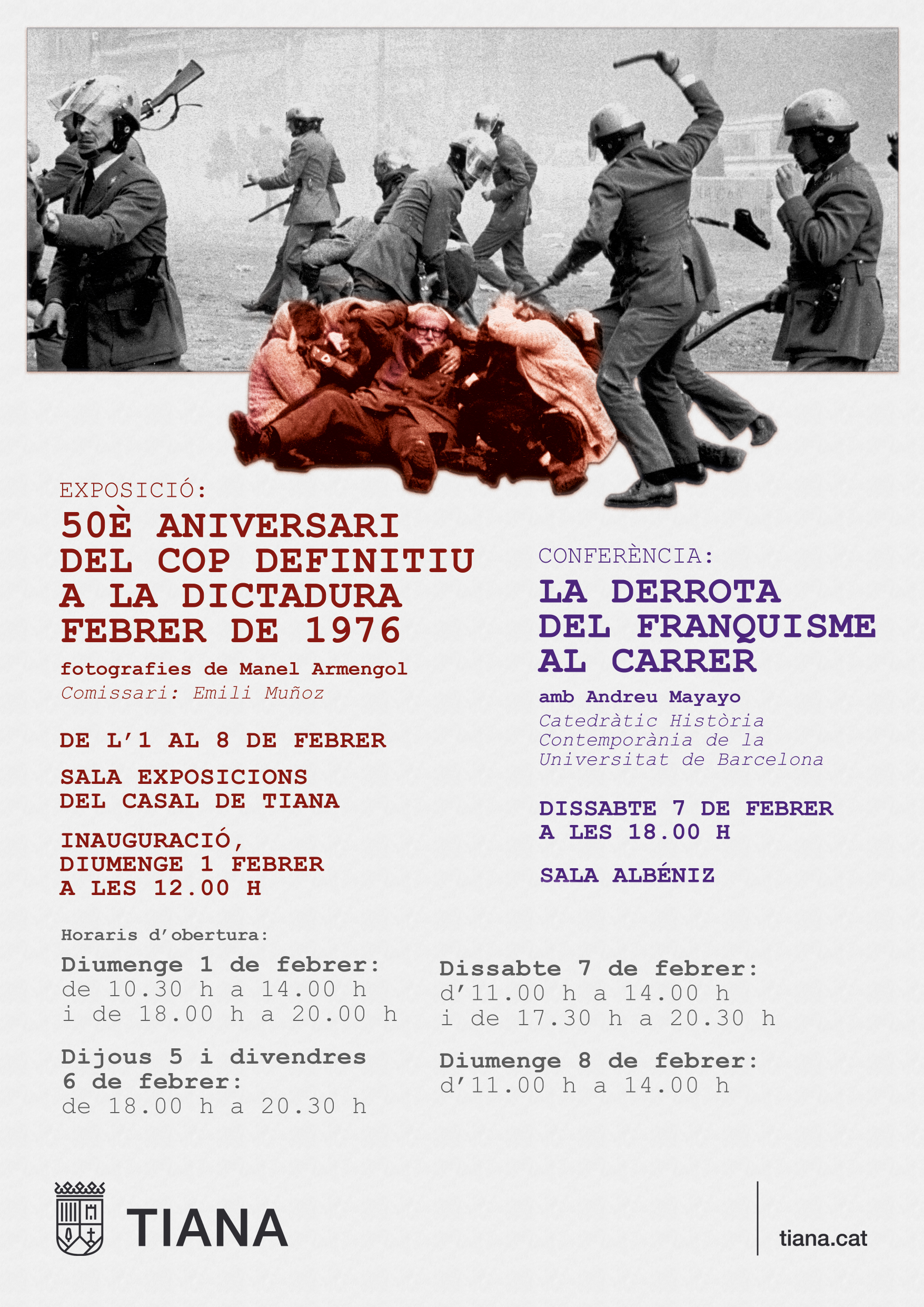 La Sala d’Exposicions del Casal de Tiana acollirà, de l’1 al 8 de febrer de 2026, l’exposició “50è aniversari del cop definitiu a la dictadura. Febrer de 1976”, un recorregut visual a través de les fotografies del fotoperiodista Manel Armengol, testimoni directe d’un dels episodis clau en la lluita popular contra el franquisme als carrers de Barcelona.